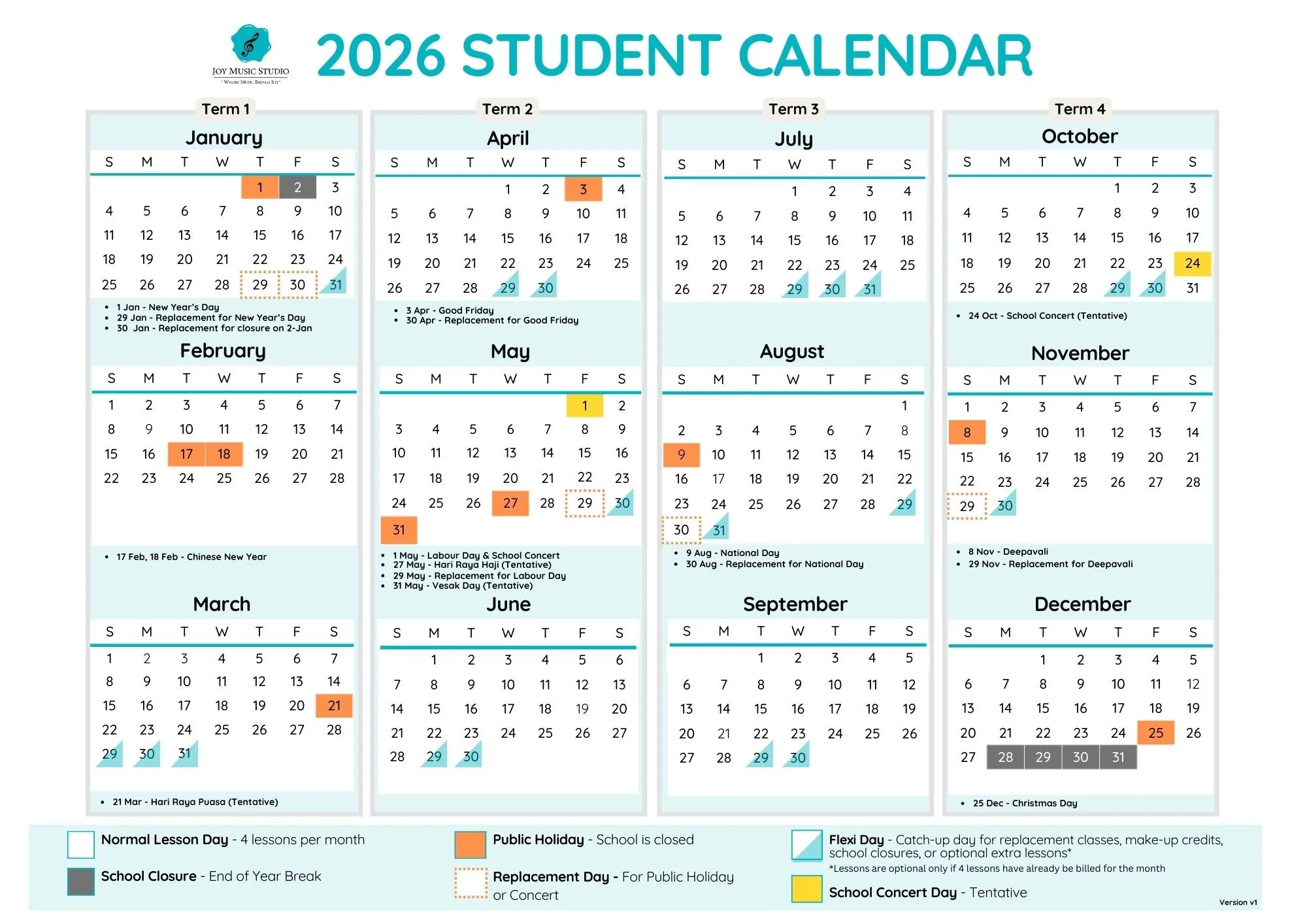 Upon enrolment, kindly review our terms & conditions, including policies on student attendance, missed lessons, and rescheduling of lessons. Please see our school policies here.